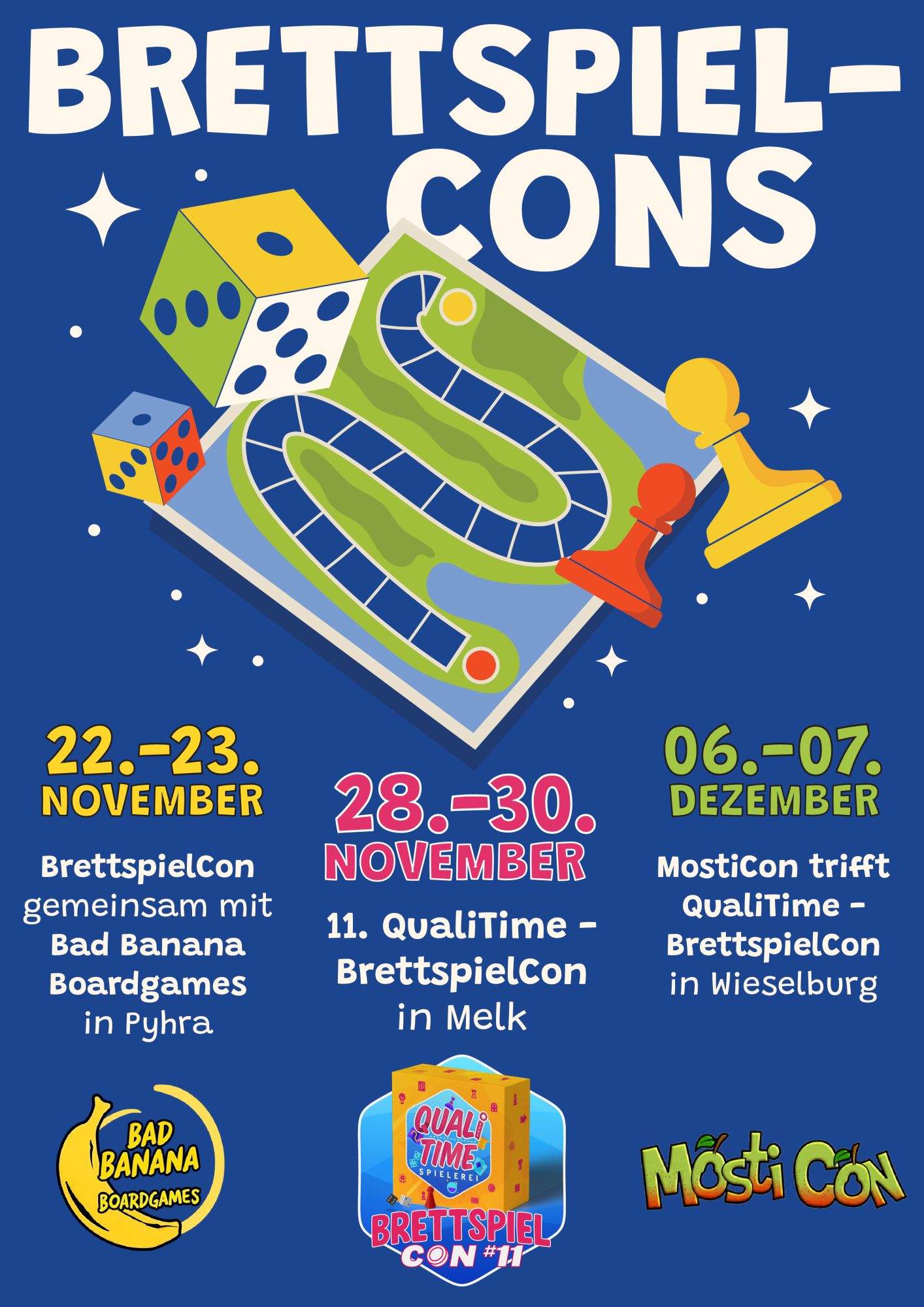 Der Herbst wird verspielt. Denn Ende November und Anfang Dezember gehts so richtig verspielt ab. Es startet mit einer tollen Kooperation mit dem Verein BadBananaBoardgames in Pyhra. Danach, von 28. – 30. November findet die 11. QualiTime – BrettspielCon, mit kapp 500 Spielen zum Testen und Kaufen, statt. Wie wenn das nicht genug wäre, ist das erste Dezember WE die MostiCon in Wieselburg. Auch hier übernehmen wir den Part mit den Brettspielen. Es darf gespielt und auch hier gekauft werden. Lasst euch also Überraschen, denn es wir mehr als nur verspielt – diese Wocheneden werden
