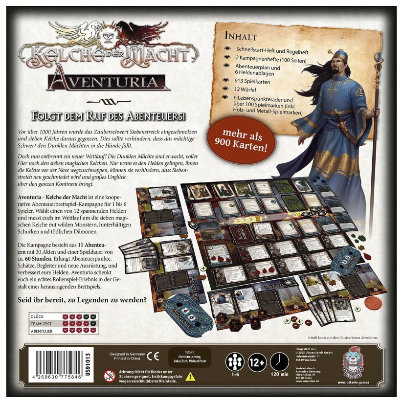 Kurzinfo: Die Mächte des Bösen sind erwacht und strecken ihre Klauen nach den Kelchen aus. Nur wackere Helden können das Unheil abwenden – in einem Wettlauf gegen Dämonen, Intrigen und uralte Kräfte. Der Ruf des Abenteuers hallt durch Aventurien … wer wird ihm folgen? Aventuria: Kelche der Macht ist eine epische, vollständig kooperative Abenteuerkampagne im Aventuria-Universum.