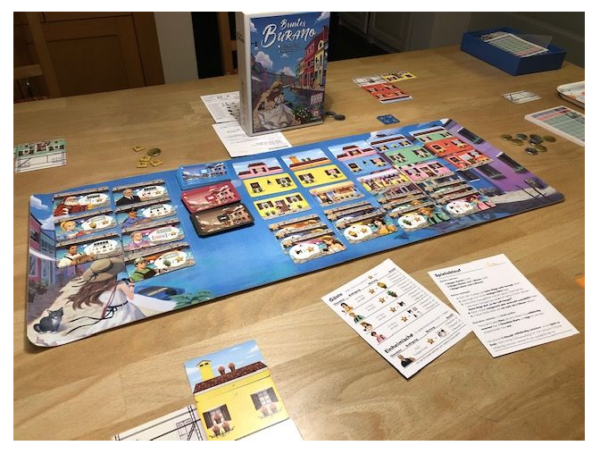 Ein Spaziergang in Burano ist ein Familienspiel. Die Spieler legen die Bodenkarten auf, um Besuch von verschiedenen Charakteren zu erhalten. Anhand der verschiedenen Symbole auf den Häusern erhalten sie Punkte. Am Ende des Spiels ist man der Spieler mit den meisten Punkten.