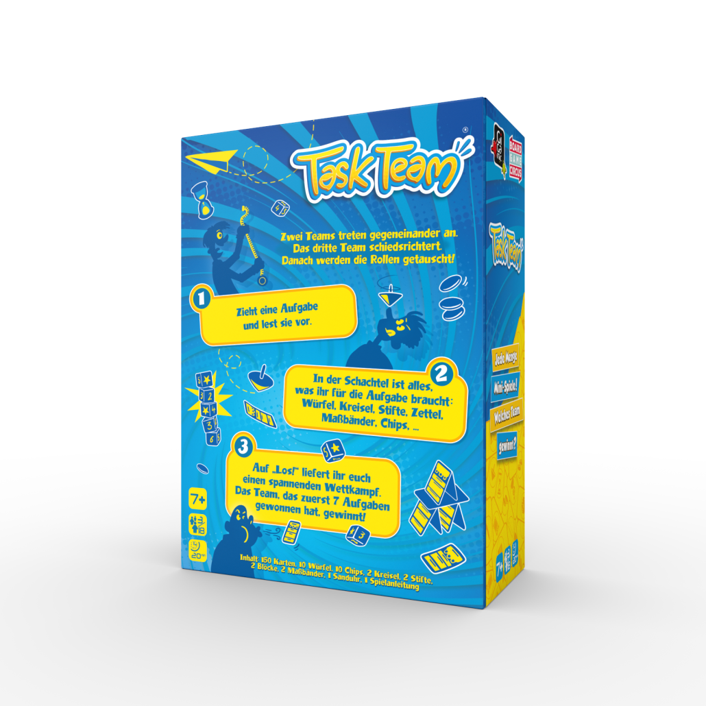 Kurzinfo: Task Team ist unser wild spaßiges Partyspiel. In Task Team stellt ihr euch unterschiedlichen Aufgaben. Nutzt dabei Würfel, Kreisel, Maßbänder und mehr, um mit eurem Team zu gewinnen. Seid bereit für 150 spaßige Minispiele, die Geschicklichkeit, Teamgeist und Schnelligkeit erfordern.